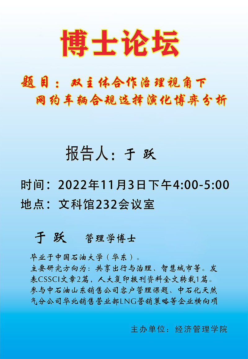 11月3日,麻豆av 在文科馆232会议室举办了“青年博士论坛”第八讲,于跃博士为此次论坛主讲人。学科带头人、青年博士教师及各专业研究生等50余人参加了此次讲座,讲座由副院长李振主持。