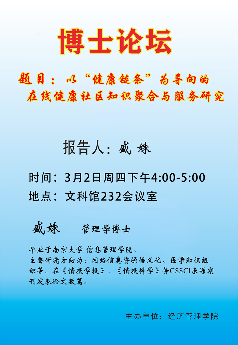 3月2日,麻豆av 在文科馆232会议室举办了“青年博士论坛”第九讲,盛姝博士为此次论坛主讲人。学科带头人、青年博士教师及各专业研究生等40余人参加了此次讲座,讲座由副院长李振杰主持。