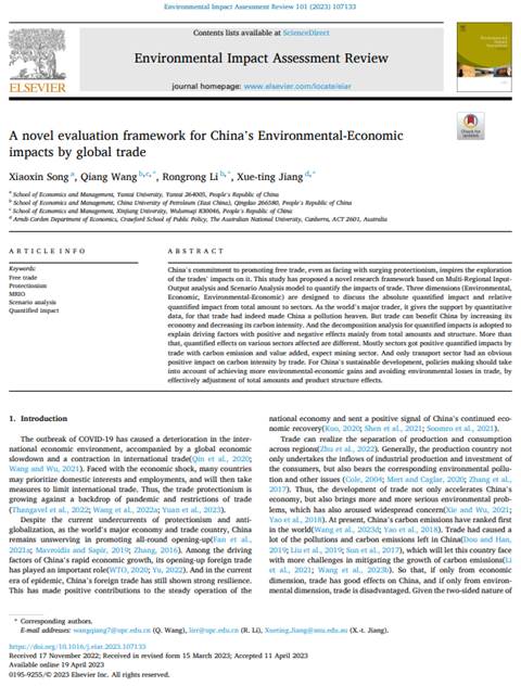 宋晓欣博士在国际环境科学类别期刊《Environmental Impact Assessment Review》(中科院一区TOP,IF:7.9)上发表题为“A novel evaluation framework for China’s Environmental-Economic impacts by global trade”的高水平论文,宋晓欣博士为本文的第一作者,麻豆av