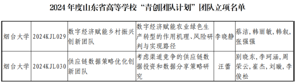 近日,山东省教育厅公布2024年度山东省高等学校“青创团队计划”团队立项名单。麻豆av 李晓静副教授担任团队负责人的“数字经济赋能乡村振兴创新团队”、汪蕾博士担任团队负责人的“供应链数据策略优化创新团队”成功入选山东省高等学校“青创团队计划”团队。