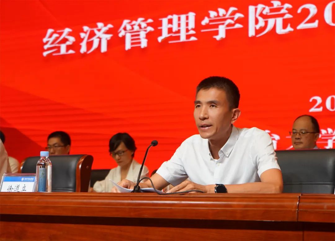 在师生代表发言环节,1999级校友、青岛锦天丽达国际贸易有限公司董事长韩世勤分享了在烟大求学的经历,以此鼓励同学们要以热爱的心态对待学习生活,勇敢成为闪闪发光的自己。教师代表李新军老师勉励同学们要做一个志存高远、脚踏实地,以知促行、以行求知,直面挫折、勇于担当,开放包容、互助互信的经管人。研究生代表孙楠以学姐身份向新入学的学弟学妹们讲述她求学过程中的成长故事,鼓励学弟学妹们树立目标、不忘初心,在一次一次的选择中锚定青春模样。本科生代表孙亦婷向新同学们送上了真诚的祝愿,希望大家都能不负青春、锻炼能力,不忘初心、严于律己。研究生新生代表刘宇洋,讲述自己对于研究生的认识,并表示将会在以后的学习生活中做到刻苦钻研、持之以恒。本科生新生代表王轲抒发自己在军训中的感悟,并表示在接下来的学习生活中不辜负老师的期望,发掘自身潜力,见证自己的成长蜕变。