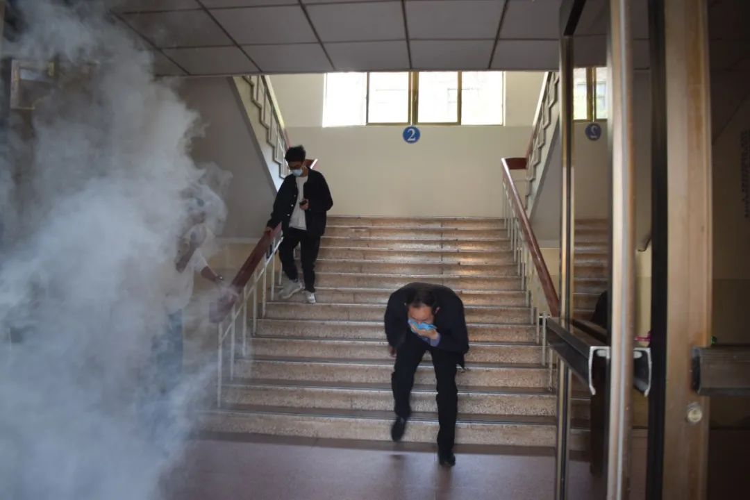 下午3时整文科馆模拟发生火情,保卫处消防科突然接收到了文科馆的报警信号,通知微型消防站出动进行模拟初期火灾扑救。学院安全员在发现文科馆一层烟雾较大后,立即启动应急预案,模拟拨打“119”报警并组织撤离。随着紧急疏散警报的拉响,各层疏散员快速喊话组织,楼内师生在指引下,用湿毛巾捂住口鼻,弯腰靠墙,迅速有序地从安全通道逃生,到升腾广场的疏散集合点,顺利完成了应急疏散环节。整个疏散过程紧张而有序,所有师生均撤离到了指定位置,未发生任何混乱和意外,达到了预期效果。