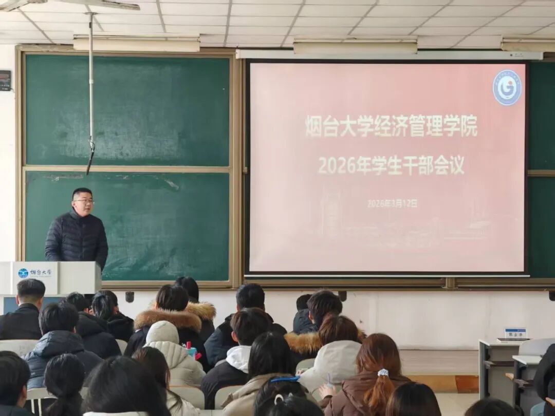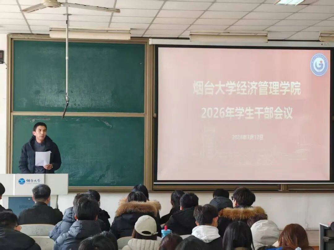 在综合楼114召开2026年第一次主要学生干部会议。经济管理学院党委副书记徐道立、全体辅导员以及主要学生干部参加,会议由团委书记张宗泽主持。